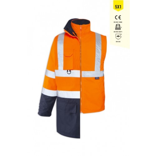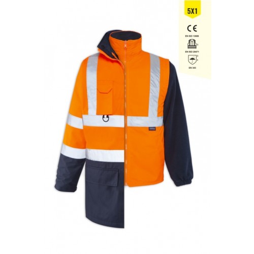 Beş farklı kullanıcı kombinasyonu sunan son derece yenilikçi ve işlevsel bir kaban. Bu çok yönlü kaban, tüm hava koşullarına uygun olarak üretilmiştir. Su geçirmezlik ve yüksek görünürlük standartlarında olduğu onaylanmıştır. Optimum sıcaklık ve konfor için astarlı yaka, telsiz cebi, D halkası, kimlik cebi, geniş saklama için çoklu cepler, yansıtıcı reflektörler, kolay saklama için gizli başlık ve kurumsal marka için baskı erişimi içerir. İç yelek polarlı iç yapısı sayesinde sıcak kalmanızı sağlarken, çıkarılabilir kollar ve çift taraflı kullanım özelliği ile hızlı ve kolay giyinme olanağı sağlar.
